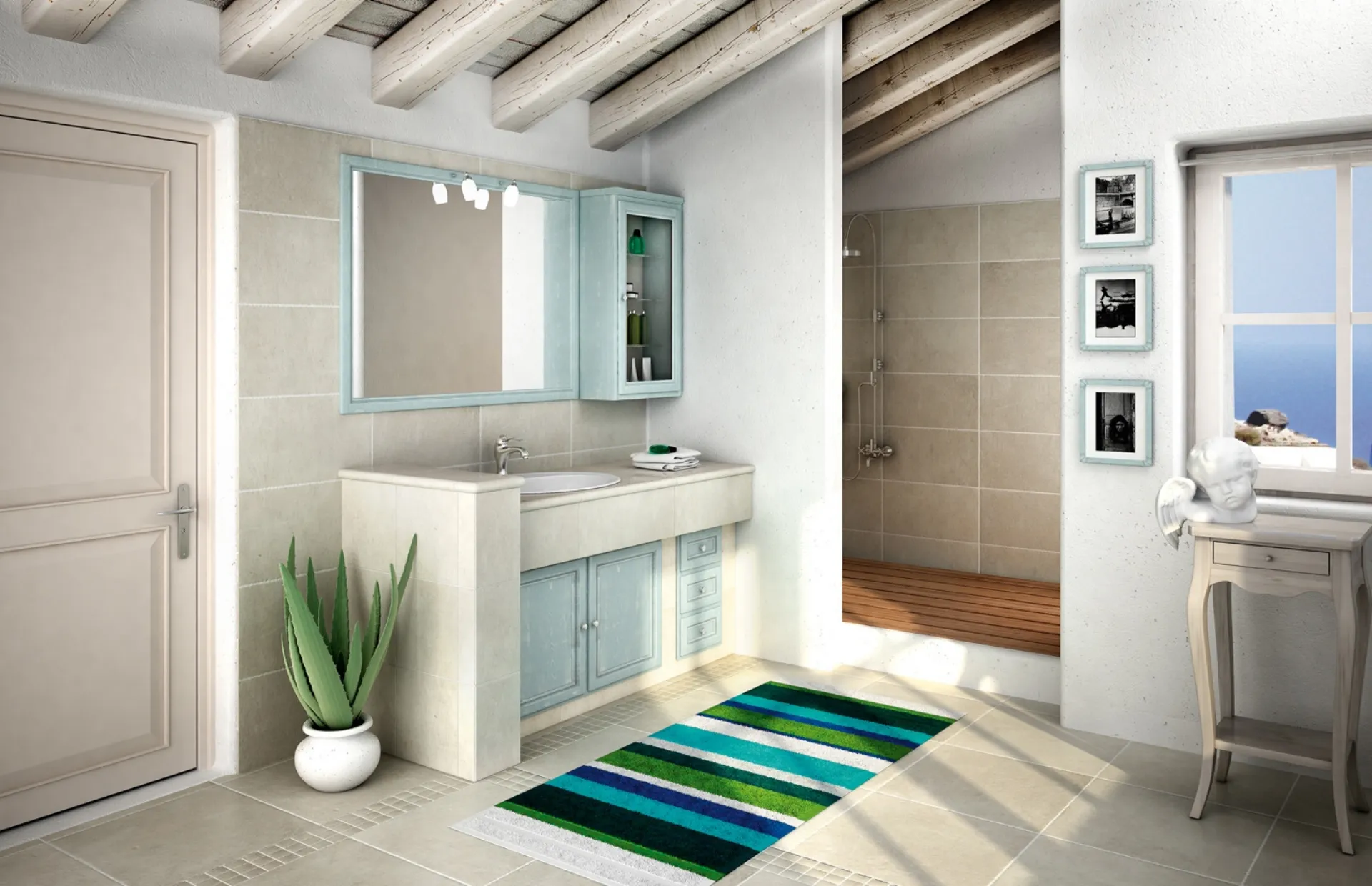 Un'altra variante per l'allestimento del bagno è il mosaico: quest'antica tecnica per fare arte oggi è la preferita dagli arredatori di interni per il rivestimento della zona bagno. Il mosaico può essere realizzato con diversi materiali: in gres porcellanato, in pietra, in pasta di vetro, in ciottoli, in quadrati d’arenaria e in marmo. Ai diversi materiali utilizzabili, corrispondono diverse gamme e effetti cromatici e visivi di grande impatto. Un’idea originale è quella di realizzare il lavabo o il piatto doccia in mosaico: in questi casi in cui le aree interessate sono sempre a contatto con l'acqua è necessario usare più cautela nell'impermeabilizzazione della superficie (si può applicare il mosaico in saune, hammam, bagni turchi). Inoltre il mosaico di vetro si può posare su un rivestimento preesistente a patto che il vecchio rivestimento sia ben ancorato alla superficie esistente e si carteggi in profondità la superficie per agevolare l’adesione della rasatura. Realizzare bagni con mosaico permette di creare accostamenti ricercati e creazioni originali, funzionali e personalizzate e le immagini bagno che è possibile vedere nelle riviste ne sono la dimostrazione.