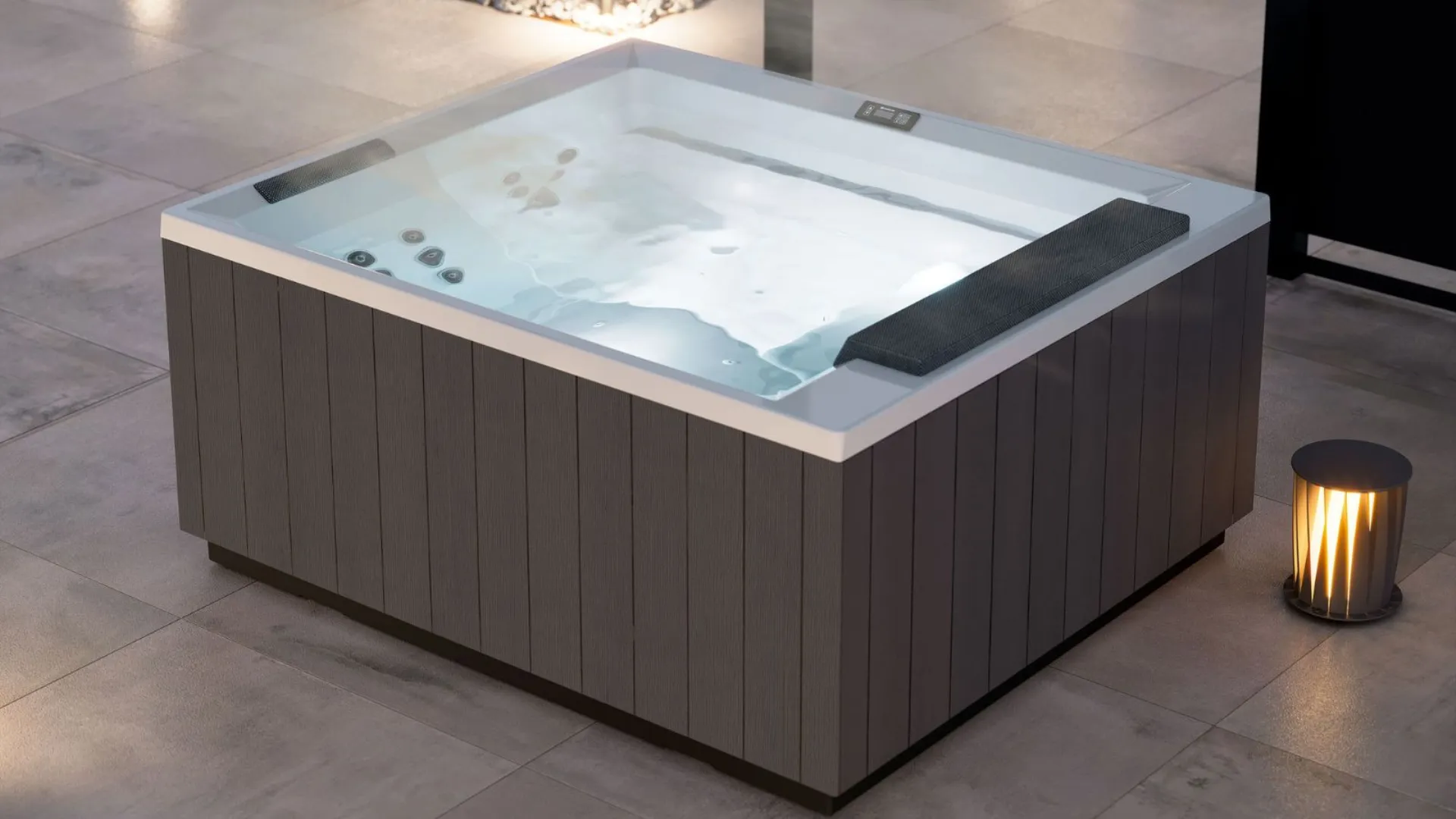 Treesse propone Maya GP, Minipiscina idromassaggio che può essere installata sia ad incasso che in appoggio con pannellatura in VTR o in finitura legno dark.