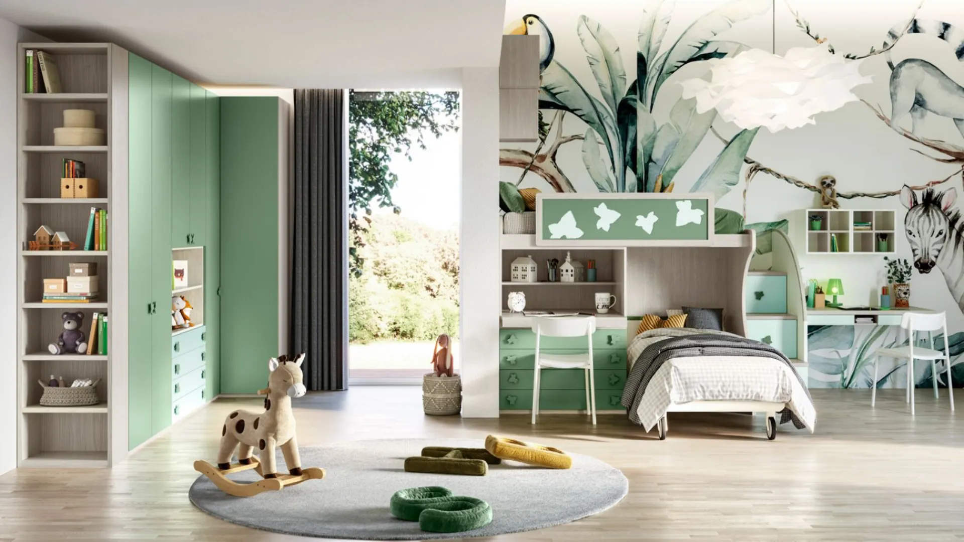 Questo arredo innovativo concentra funzioni diverse in un solo elemento sfruttando lo sviluppo in altezza. L’ingombro a terra si riduce e il resto della stanza resta libero per gioco e movimento.
