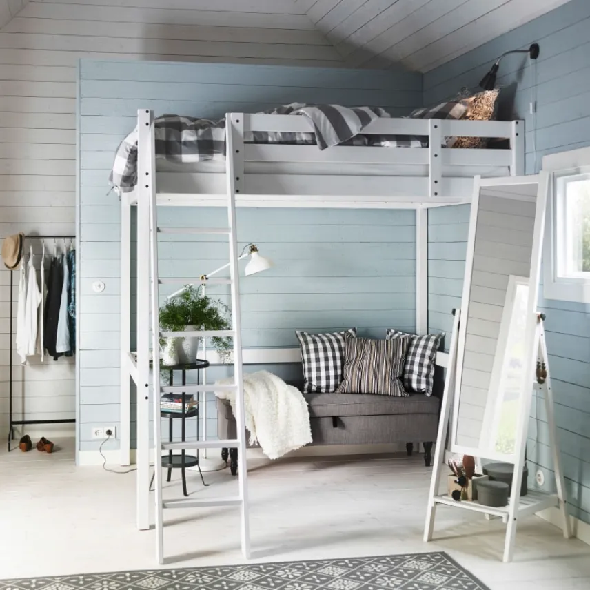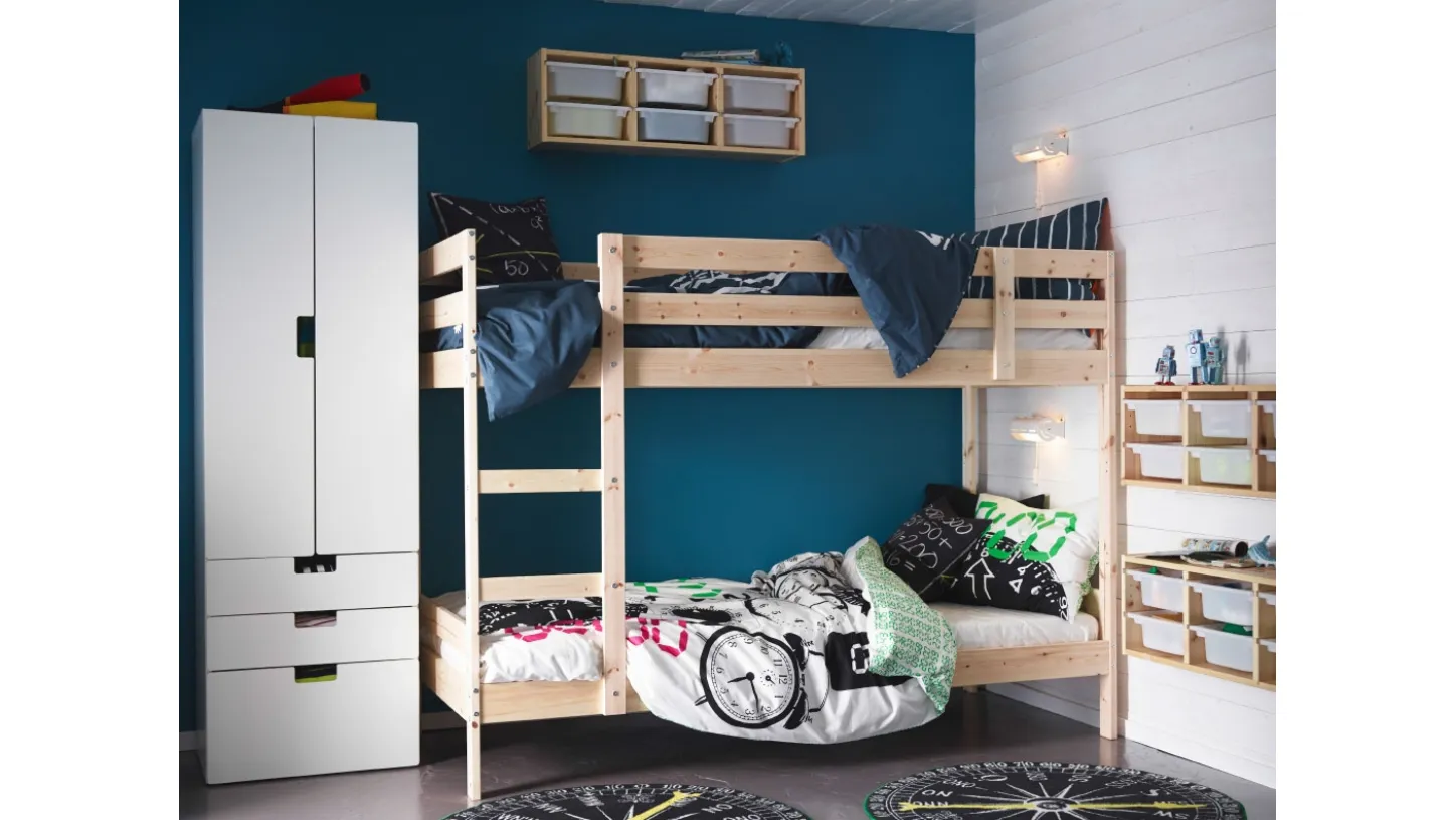 Gli elementi che non possono mancare nella cameretta dei ragazzi sono il letto, una zona guardaroba per vestiti, ma anche cartella, libri e giochi e uno spazio attrezzato per lo studio con scrivania e postazione computer. Tra la gamma di letti a castello IKEA, spicca la serie STUVA che è in grado di rispondere a queste esigenze con un'unica struttura. Il letto a castello qui diventa totalmente a scomparsa: la parte superiore è consacrata a zona sonno con un'alta sponda che mimetizza completamente il letto e garantisce la sicurezza dei bambini (anche se IKEA sconsiglia i letti a castello/soppalco ai bimbi inferiori ai 6 anni di età); la scala per salire si fonde alla libreria e al guardaroba che in questo caso funziona anche da sostegno del soppalco, in questo modo al "piano terra" viene a crearsi una zona libera attrezzata con una scrivania ed una cassettiera perfette per lo studio. I letti STUVA sono proposti in total white oppure a base bianca con elementi a contrasto che possono essere scelti di colore blu, rosa, verde, nero e betulla; alla stessa gamma appartengono anche una gran varietà di mobili contenitori da abbinare tra loro per soluzioni veramente su misura.