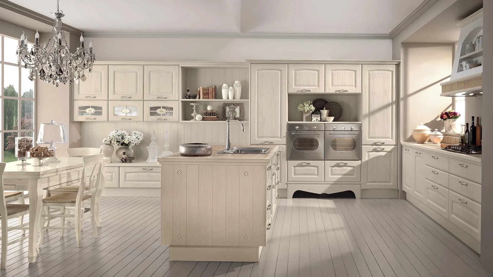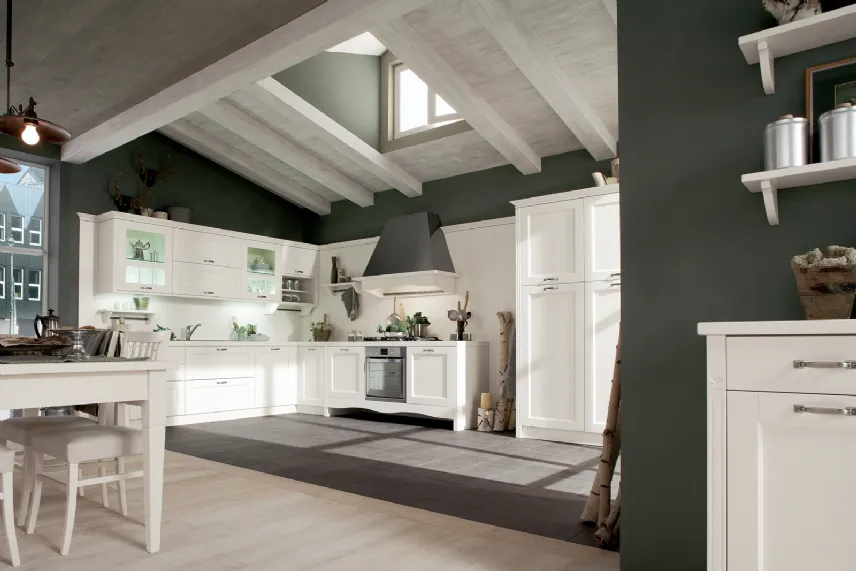 Le cucine moderne in stile country hanno il pregio di ricondurci ai buoni sapori di una volta, senza rinunciare alla praticità data dalla modernità. La solidità delle strutture, la cura di ogni singolo dettaglio, l'utilizzo di materiali importanti, spesso rubati alla natura, quali il legno massello, la pietra naturale per il top e la ferramenta in rame, rendono queste cucine uno degli ambienti più belli della casa. La scelta migliore per chi predilige un'atmosfera tradizionale, calda ed accogliente, che va sempre di moda. Rappresentano la passione per le cose autentiche del passato, con l'intelligenza di chi guarda al presente ed al futuro. E’ il connubio perfetto tra stile e funzionalità, per adeguare le esigenze della vita moderna ad uno spazio comodo da vivere. In foto vi proponiamo la cucina Veronica di Lube. Con il suo legno di colore bianco vintage, con le sue maniglie a ponte in finitura argento antico, con il suo top piastrellato di Sassi del Piave, questa cucina rispetta il perfetto stile country chic. Una cucina che assicura l'ordine tramite i suoi spazi ben organizzati, in cui ogni cosa trova il suo posto.