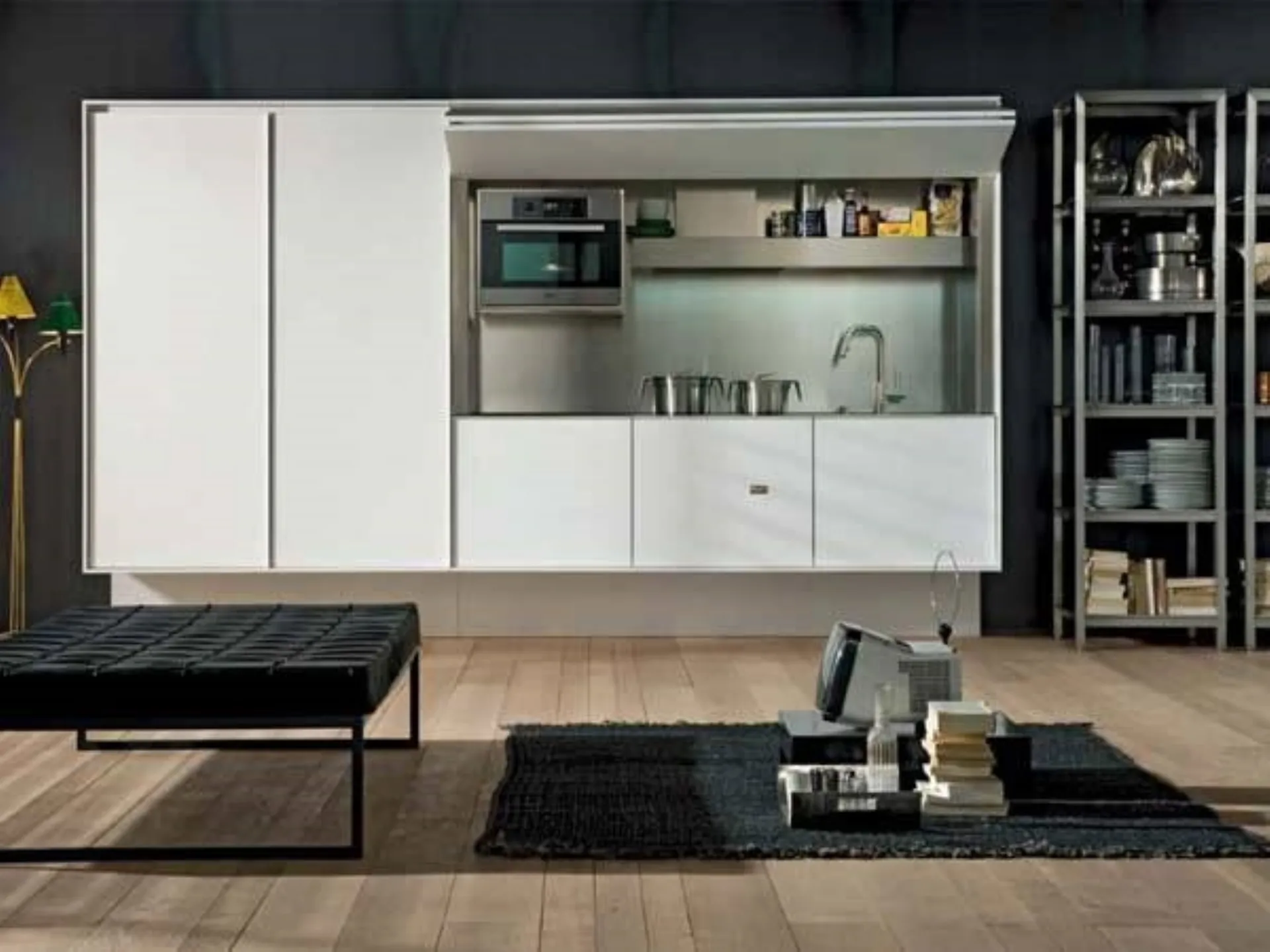 Che cosa ci serve per dare vita a mobili per cucine piccole? Il necessario e il fondamentale come sempre, è racchiudibile in un blocco cucina, pratico e funzionale che assolve tutte le funzioni utili in questo spazio. L’utile e il necessario, il superfluo e il secondario. Utile e necessario, fondamentale per quest’ambiente sono il piano cottura, il lavabo e il forno. Utile ma non fondamentale tutti i mobili di contorno, che potremo sostituire con altri arredi complementari, anche staccati dal blocco fondamentale. Elementi a tutta altezza completeranno con stile e funzionalità lo spazio. In foto: Cucina monoblocco a scomparsa Boffi On/Off in finitura laccato Mat Plus