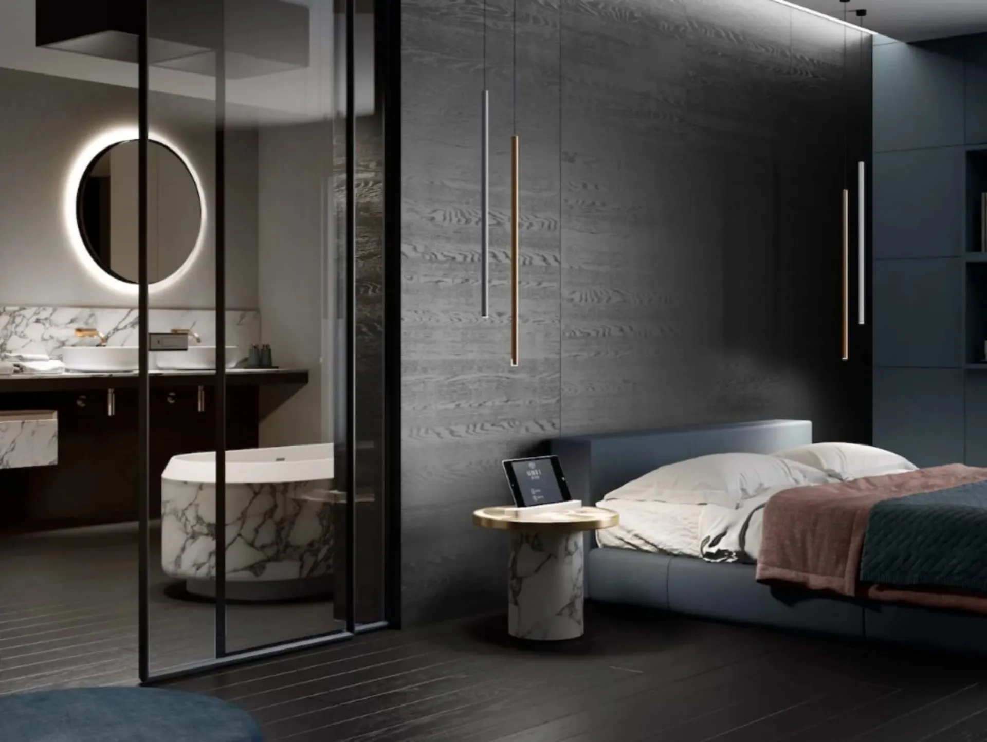 Arreda la parete dietro al letto matrimoniale con il gres porcellanato