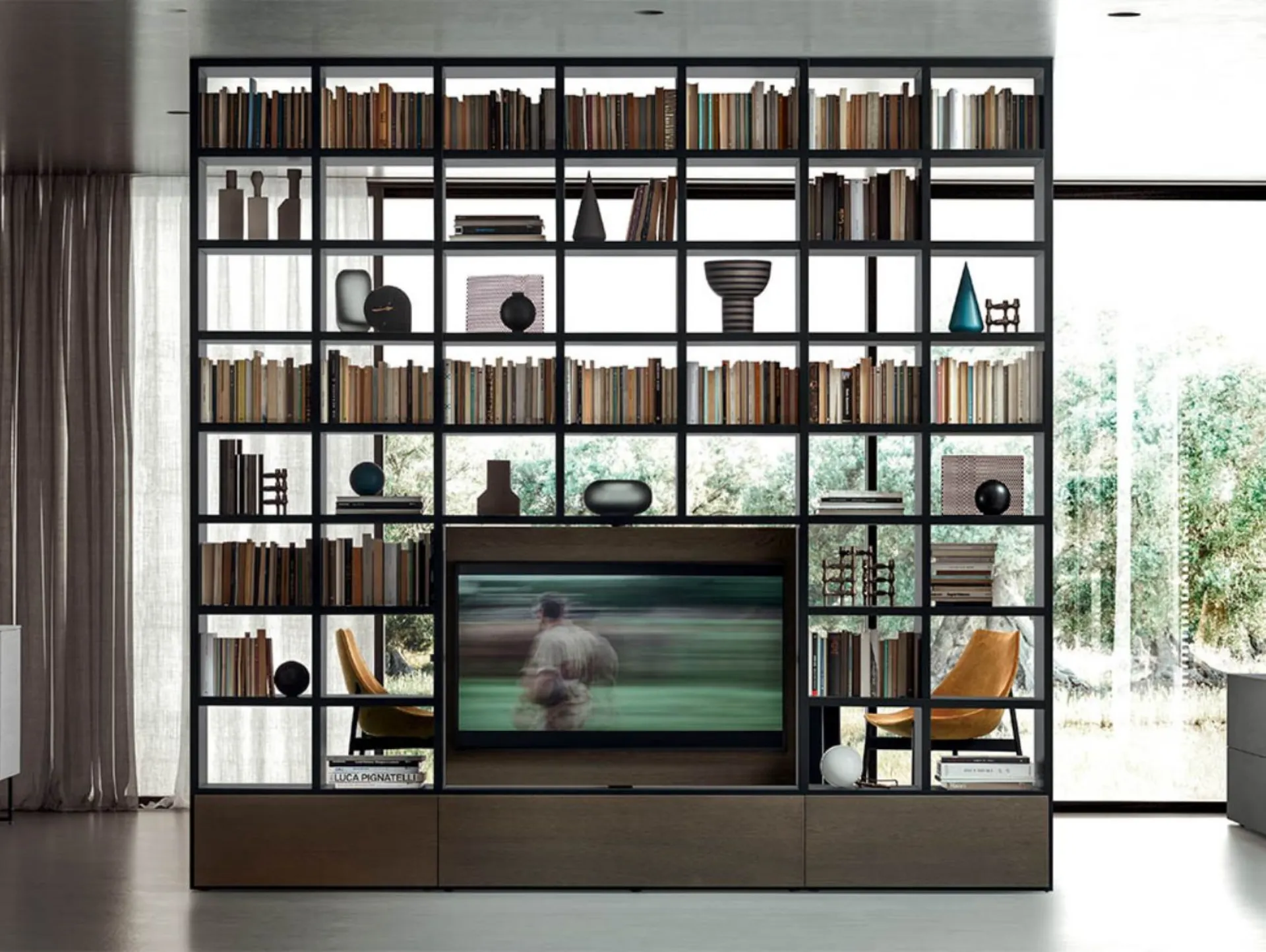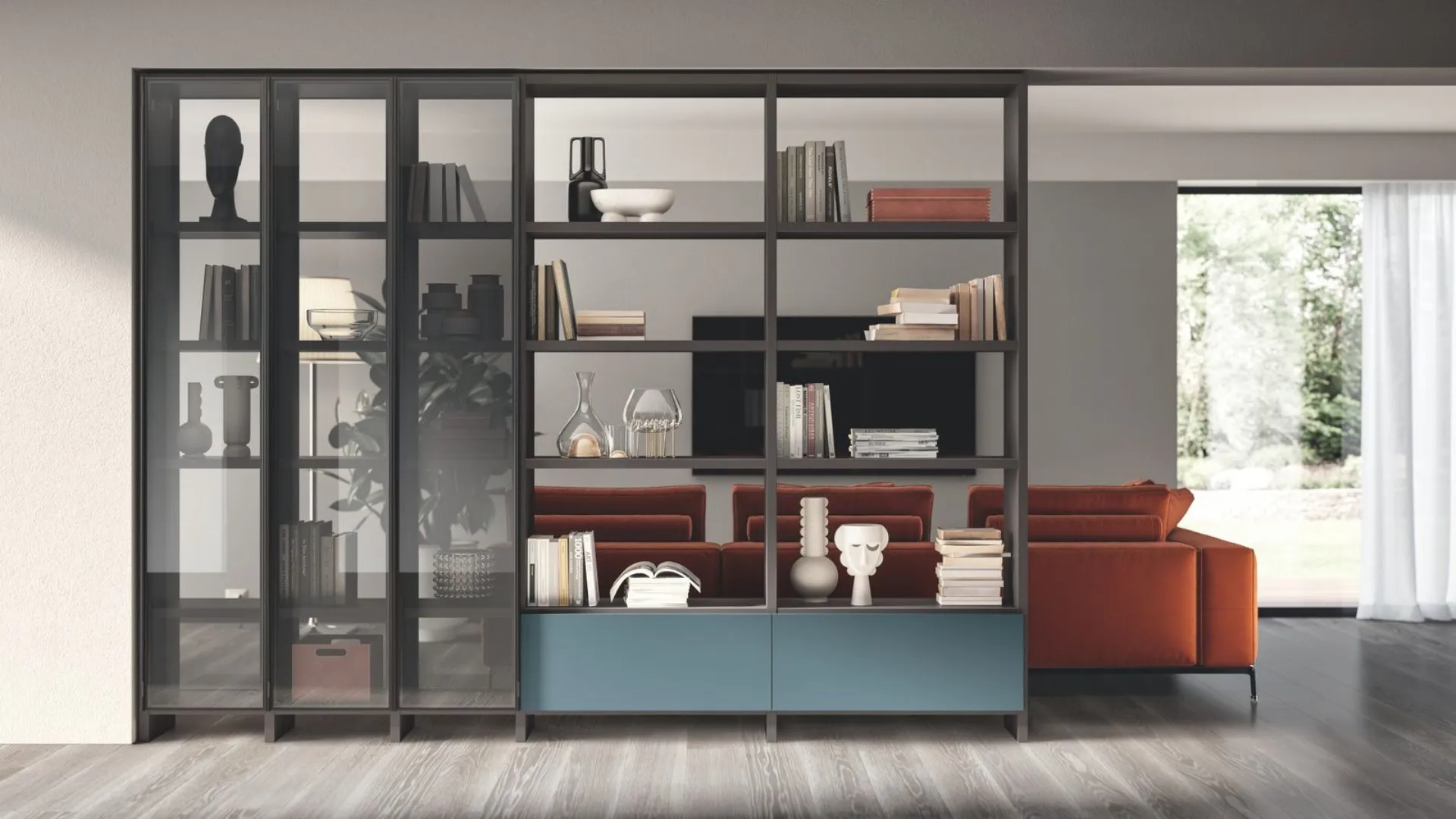 La libreria bifacciale è perfetta per chi desidera rimodulare i volumi dentro casa senza affrontare lavori di muratura. Trova la massima espressione negli open space contemporanei, dove nasce l'esigenza di distinguere chiaramente la zona operativa dall'area relax. Non chiude la visuale e definisce i confini in modo discreto, lasciando circolare la luce naturale tra le diverse zone. Se la libreria è dotata di vano porta TV è ideale nella cucina con soggiorno a vista. Le intercapedini integrate nella struttura accolgono i cavi elettrici e li rendono perfettamente invisibili.