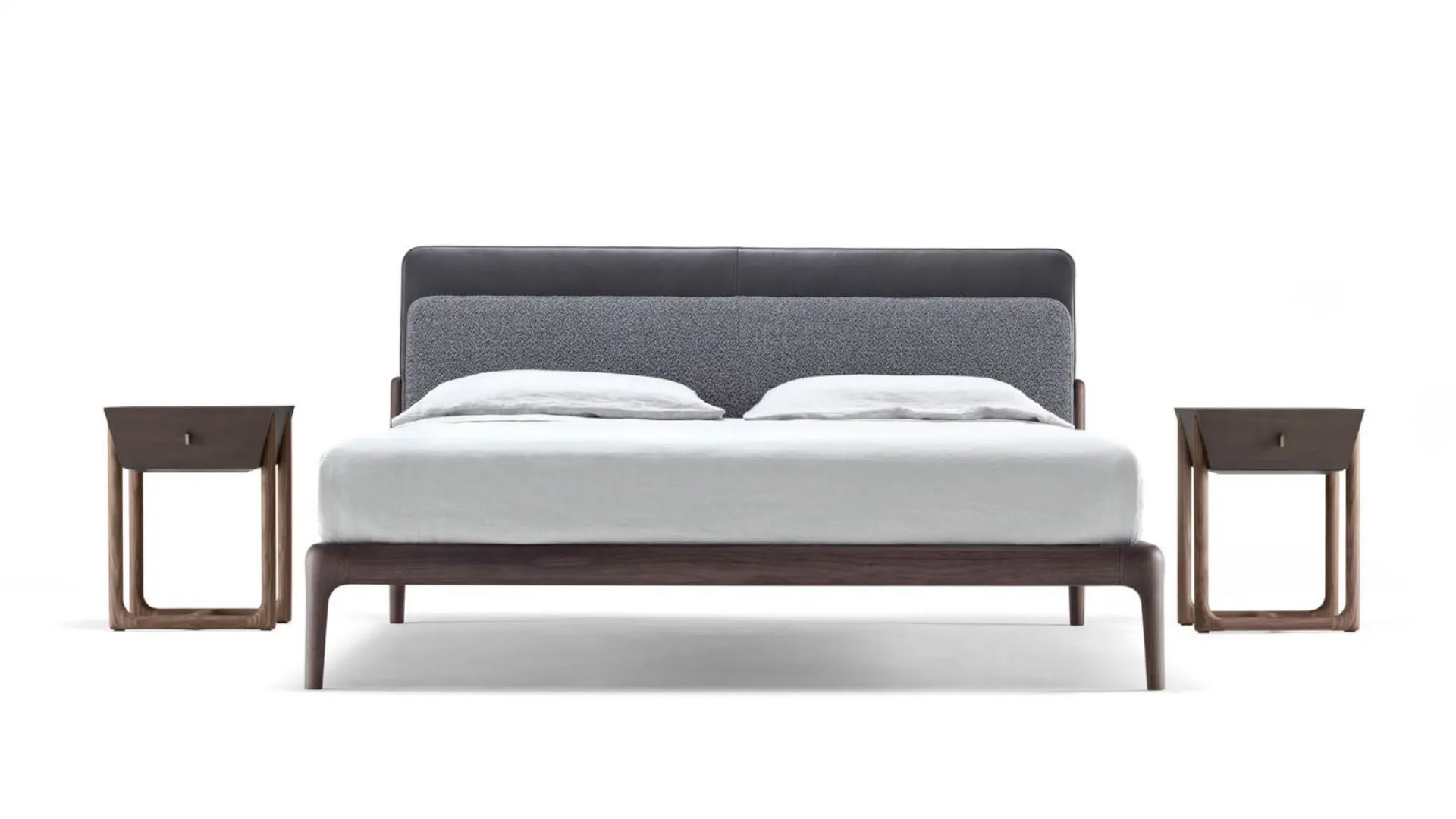 Park, è un letto con testiera in tessuto e pelle, con giroletto in legno di Novamobili, che mostra la massima cura nei dettagli.