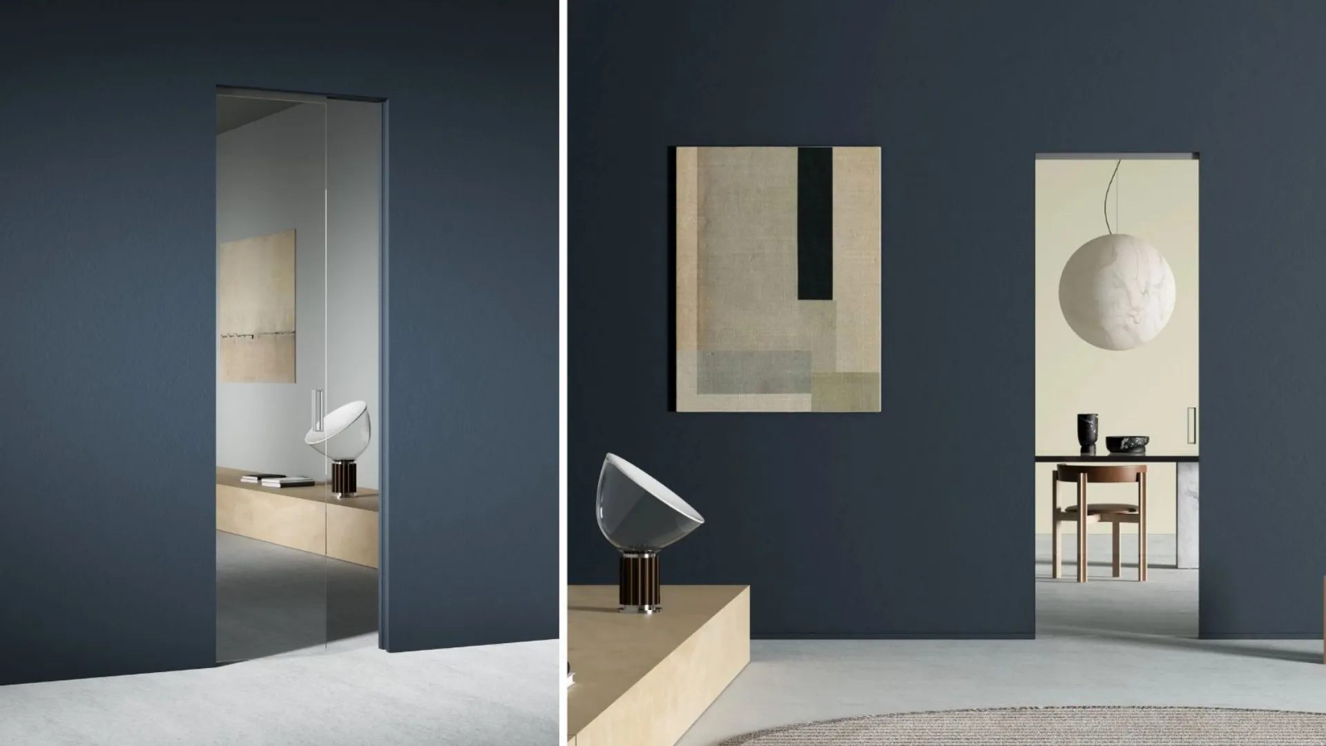 - Scorrevole interno muro (a scomparsa): è la soluzione perfetta durante le fasi di ristrutturazione o nuova costruzione. L'anta in vetro scivola all'interno di un controtelaio metallico murato o inserito nel cartongesso. La parete rimane completamente libera per ospitare mobili, lampade da terra, termoarredi di design o quadri.