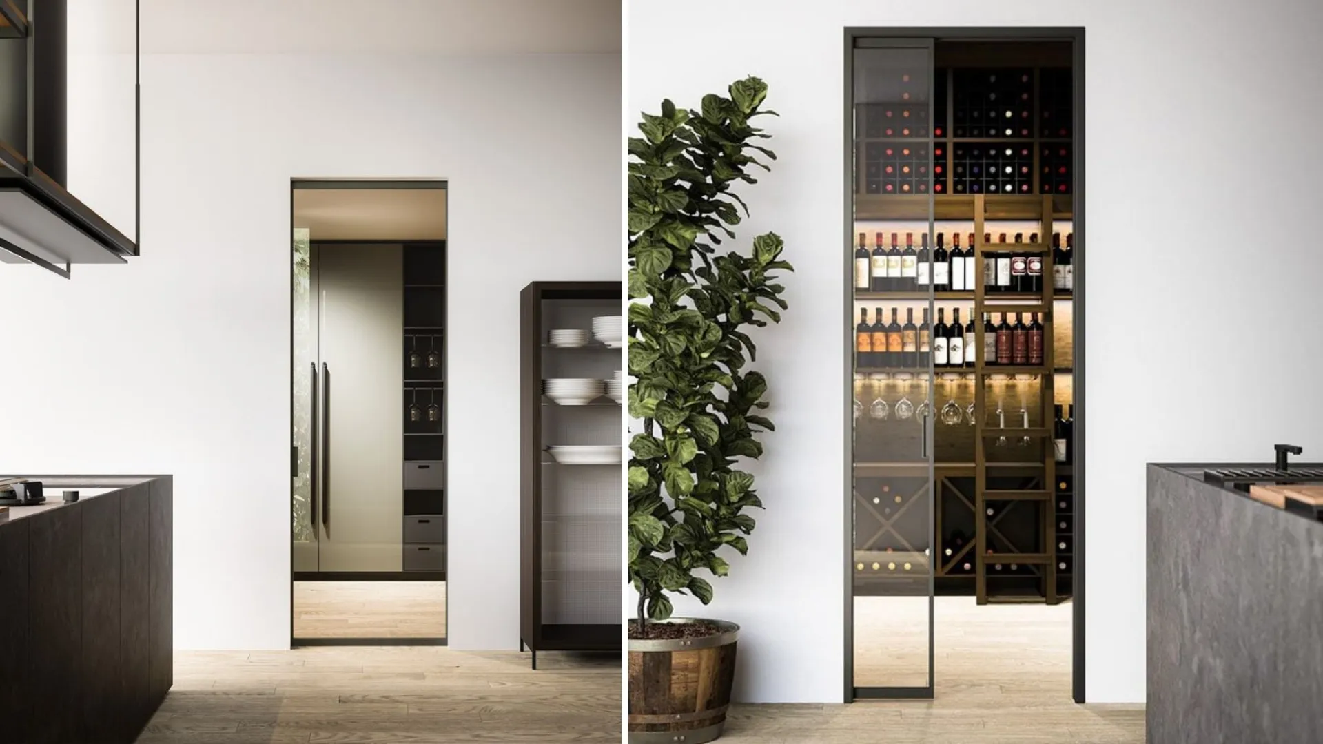 - Sono vantaggiose rispetto ad una porta a battente o scorrevole esterno muro perché l'anta non occupa spazio durante l'apertura.