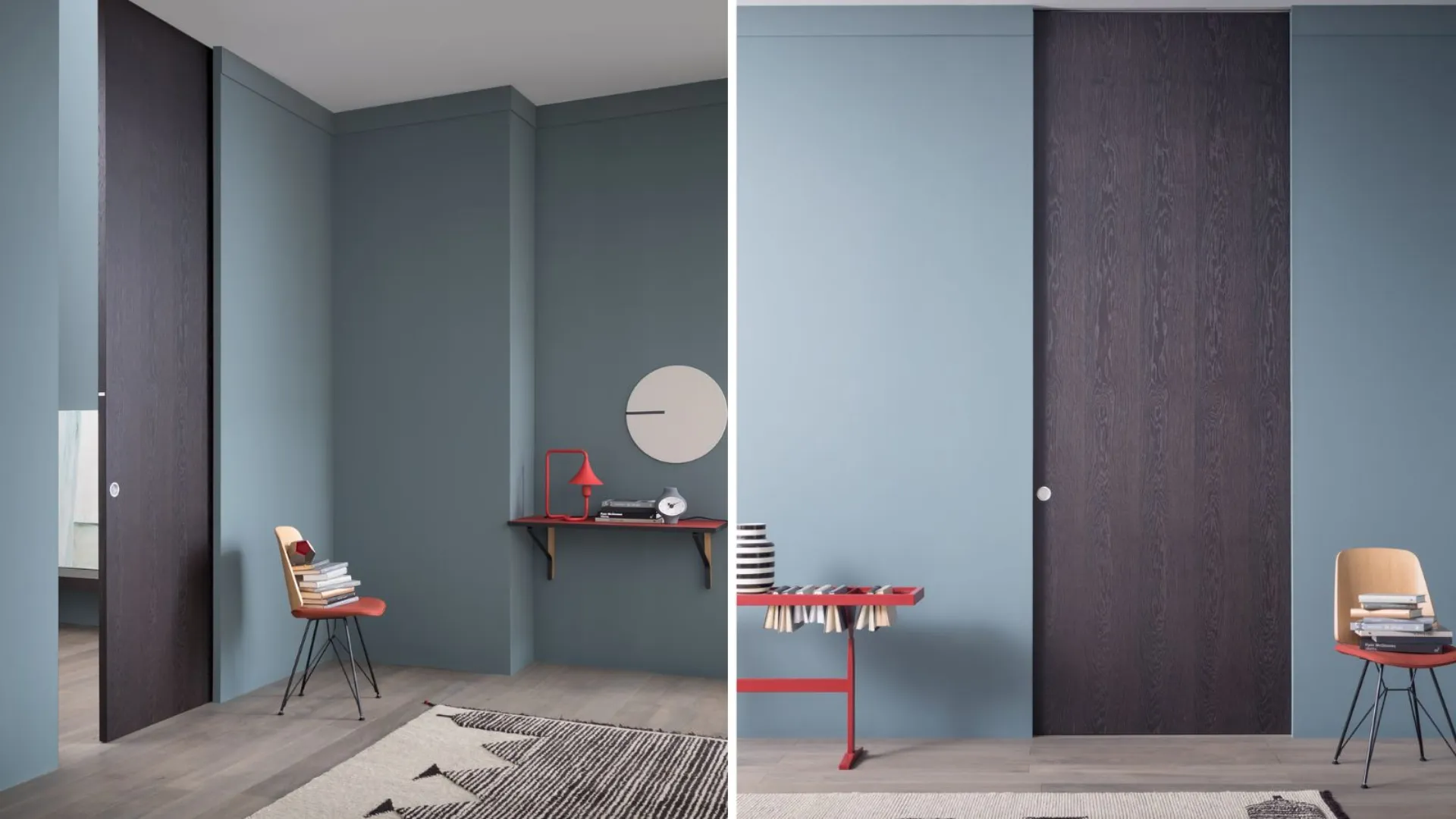 Nel primo caso il serramento diventa un segno architettonico definito, dove la porta si percepisce al primo sguardo. Nella variante filomuro il varco è essenziale e non mostra alcun dettaglio sul perimetro. In entrambi i casi è possibile privilegiare una continuità cromatica rigorosa oppure un piacevole contrasto.