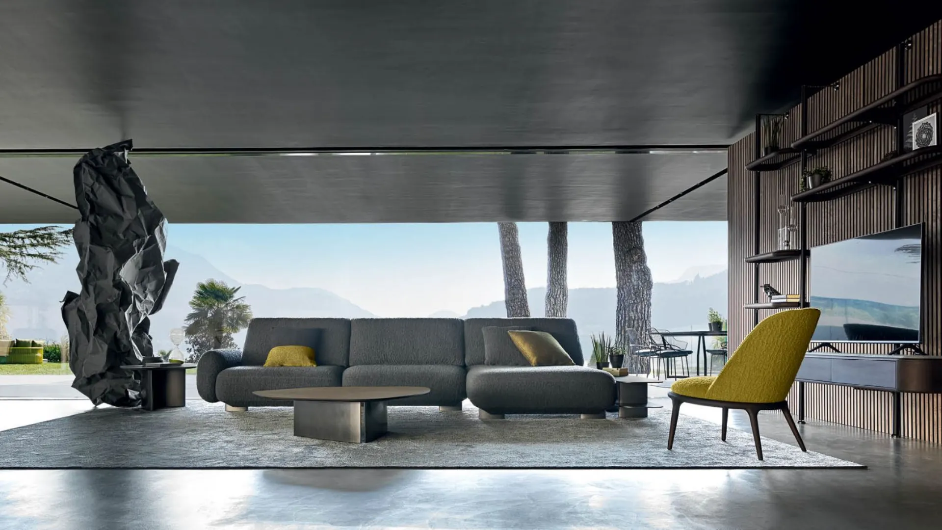 Il divano Biscuit di Porro è elegante e confortevole, con ampie cuscinature. La struttura è rivestita in tessuto.